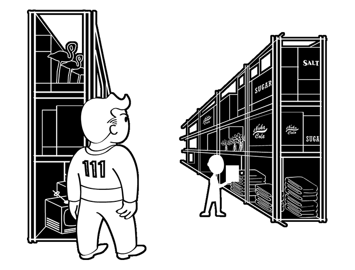 - Mit einem Powerrüstungs-Jetpack ist es möglich, die „Welt zu verlassen“ und fast die gesamten Flughafenruinen zu überspringen. Man geht einfach in die offene Aufzugtür, neben der verschlossenen und fliegt nach oben und geht durch die offene Tür. Dreht man sich um etwa 120° nach rechts und sieht das blinkende rote Licht springt man dort hin und man ist direkt in Clarkes Raum.
