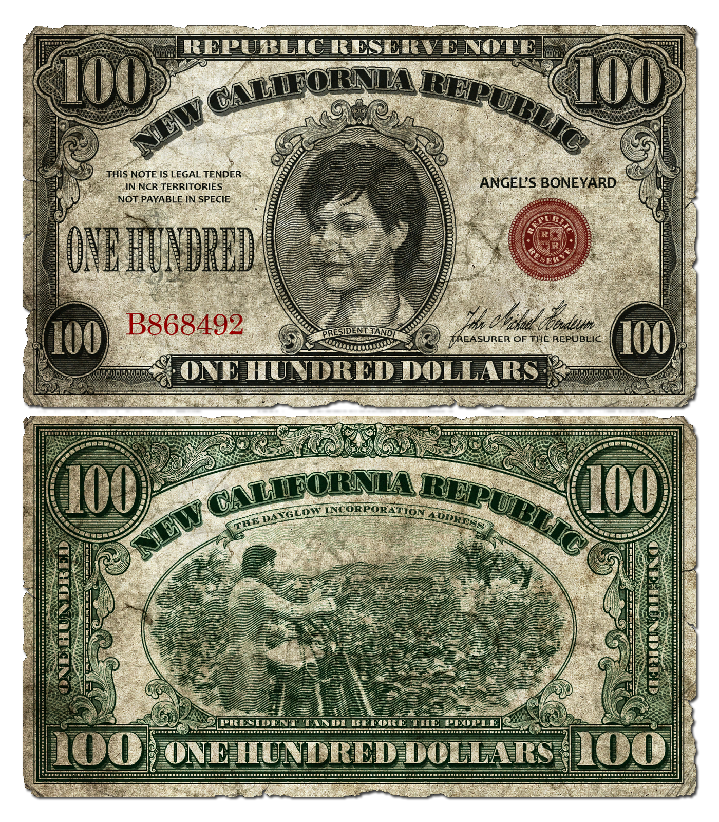 Der 100-Dollar-Schein der Republik Neukalifornien zeigt auf der Vorderseite ein Bild von Präsidentin Tandi und auf der Rückseite eine Abbildung ihrer Rede anlässlich der Gründung von Dayglow. Es handelt sich um den RNK-Dollar-Schein mit dem höchsten Wert. Wie alle Währungen in Fallout: New Vegas Fallout: New Vegas wird auch der 100-RNK-Dollar-Schein nicht von der Feilschfertigkeit des Kuriers beeinflusst. Er ist immer 40 Kronkorken wert, unabhängig davon, ob der Kurier ihn kauft oder verkauft.