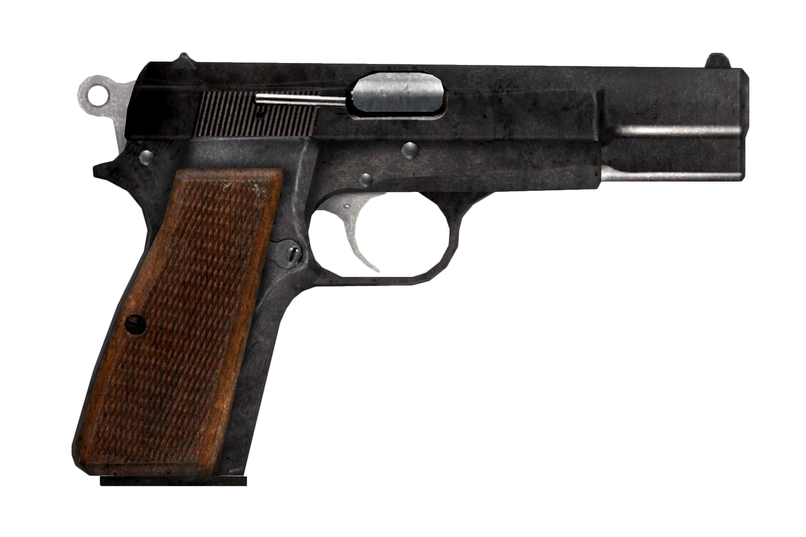 - ^ J.E. Sawyer on Formspring:“In my opinion, the BHP is a timeless design and its form is quite distinctive when compared to Fallout's 10mm pistols. Also, since I knew we weren't going to implement an M1911-style .45, the BHP-based 9mm design gives an extremely similar aesthetic (so similar that a lot of people assume it IS an M1911) while fitting into the 9mm/10mm/12.7mm semi-auto handgun progression in F:NV.”— J.E. Sawyer, Formspring