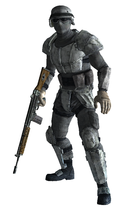 This troop type wears a Wintertaugliche T-51b-Powerrüstung and is armed with an R91 assault rifle. They are only seen patrolling in and around the US-Einsatzhauptquartier. They are always male, but their rasse is random.