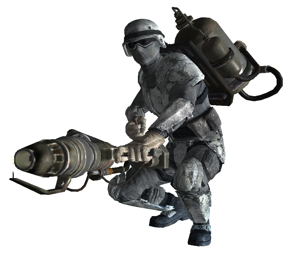 Only one U.S. paratrooper appears in the simulation, dropping from the ceiling of the Cave Outpost in The Guns of Anchorage and leaving his scoped Gauss rifle for the player to take after his Wintertaugliche Kampfrüstung fails to protect him from Chinese soldiers. It is not worth trying to save him, because his death is a scripted event.