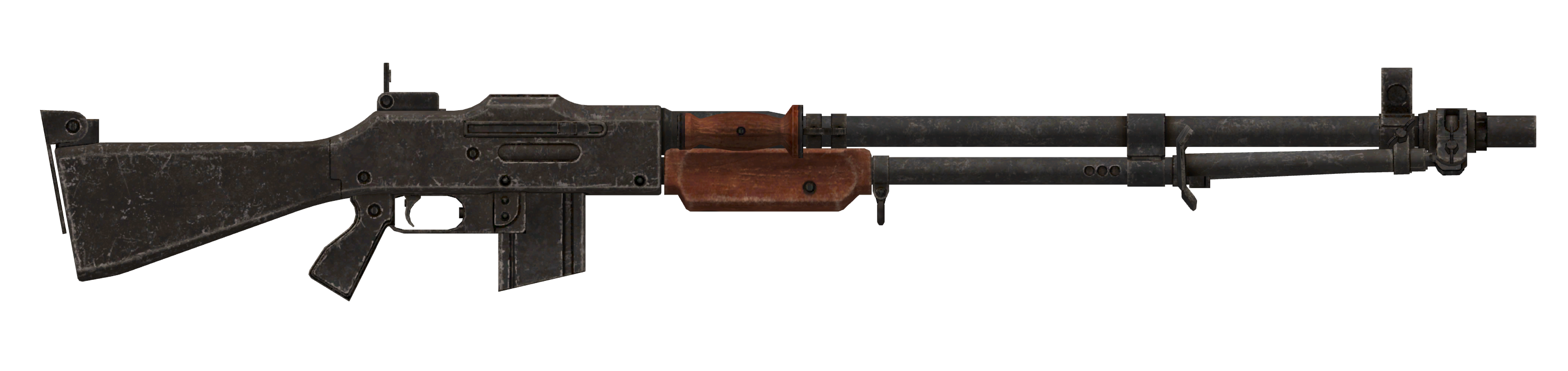 Dieses Maschinengewehr ist eine starke .308 Waffe. Das Magazin fasst 20 Schuss. Die Waffe macht mehr Schaden pro Schuss, als jede andere Vollautomatische Projektilwaffe im Spiel und hat eine vergleichsweise große Chance auf Kritische Treffer.