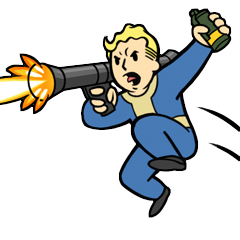 - Auf dem Bild hält der Vault Boy einen Raketenwerfer und eine Granate.