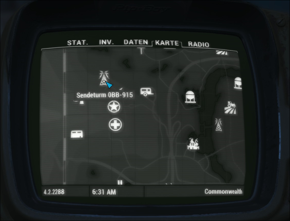 | Diese Datei wurde in dem Video-Spiel Fallout 4 aufgenommen oder stammt von Webseiten, die erstellt und im Besitz von Bethesda Softworks sind, deren Urheberrecht von Bethesda Softworks beansprucht wird. Alle im Bild vorhandenen Warenzeichen und eingetragenen Warenzeichen sind Eigentum von Bethesda Softworks. Die Verwendung von Bildern in Artikeln zur Veranschaulichung des Themas der fraglichen Bilder gilt nach dem US-amerikanischen Urheberrechtsgesetz als fair use, da eine solche Darstellung das Recht des Urheberrechtsinhabers, das urheberrechtlich geschützte Material zu verkaufen, nicht wesentlich beeinträchtigt und in diesem Zusammenhang nicht dazu verwendet wird, Gewinn zu erzielen. |