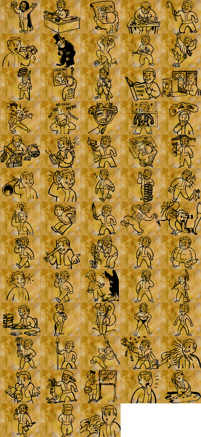 | 07:08, 17. Mär. 2011 | 700 × 1.755 (326 KB) | Ghouly89 (Diskussion | Beiträge) | These Vault Boy image tiles can be found in the game files for the Fallout demo, but they were not used in the final game because they were designed for GURPS style gameplay, of which Interplay lost the license to use |