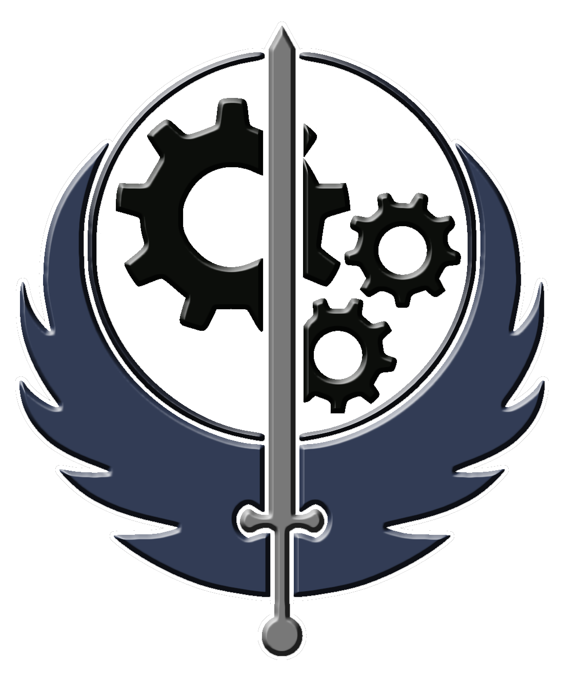 Die Insignien der Bruderschaft besteht aus mehreren Teilen und jeder steht für verschiedene Aspekte innerhalb der Bruderschaft. Die Zahnräder vermitteln das technische Wissen, das große Bereiche der Bruderschaft prägt. Das Schwert steht für den Willen und die Begabung, sich im Notfall verteidigen zu können. Die Flügel stehen für die Hoffnung, das durch Erwerb von Vorkriegs-Technologie die Menschheit, die von der Tragödie des Großen Kriegs heimgesucht wurde, eines Tages gerettet werden kann. Der Kreis stellt die brüderliche Einheit, die die Bruderschaft ausmacht, dar.