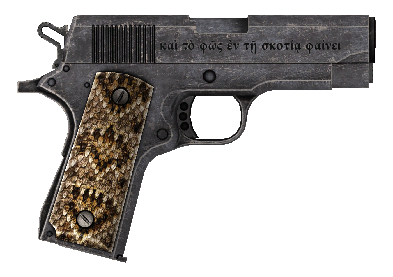 - The phrase engraved on the slide of the pistol is from the Bible passage John 1:5, "And the light shineth in darkness, and the darkness comprehended it not."