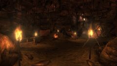 Eine Gruppe von Kriegern des Stammes der Wüstenpferde befinden sich direkt hinter dem Eingang.Einer von ihnen fragt den Spieler warum her hier sei. Die Höhle besteht aus zwei Hauptkammern. Die kleinere enthält ein paar Weißbein Zelte. In der größeren Kammer befindet sich Joshua Graham. Er enthält eine Werkbank und eine Nachladebank. Der hintere Ausgang führt zu einem von Felsen umschlossenen Bereich, der als weiterer Lagerplatz für die Wüstenpferde dient. In einer Ecke dieses Bereichs befindet sich einer von sechs Überlebenslager.