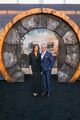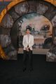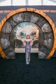 Ella Purnell (r.) gibt ein Autogramm auf den Helm einer Powerrüstung