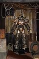 Ein Soldat der Stählernen Bruderschaft vor einer Kulisse im Fallout-Stil
