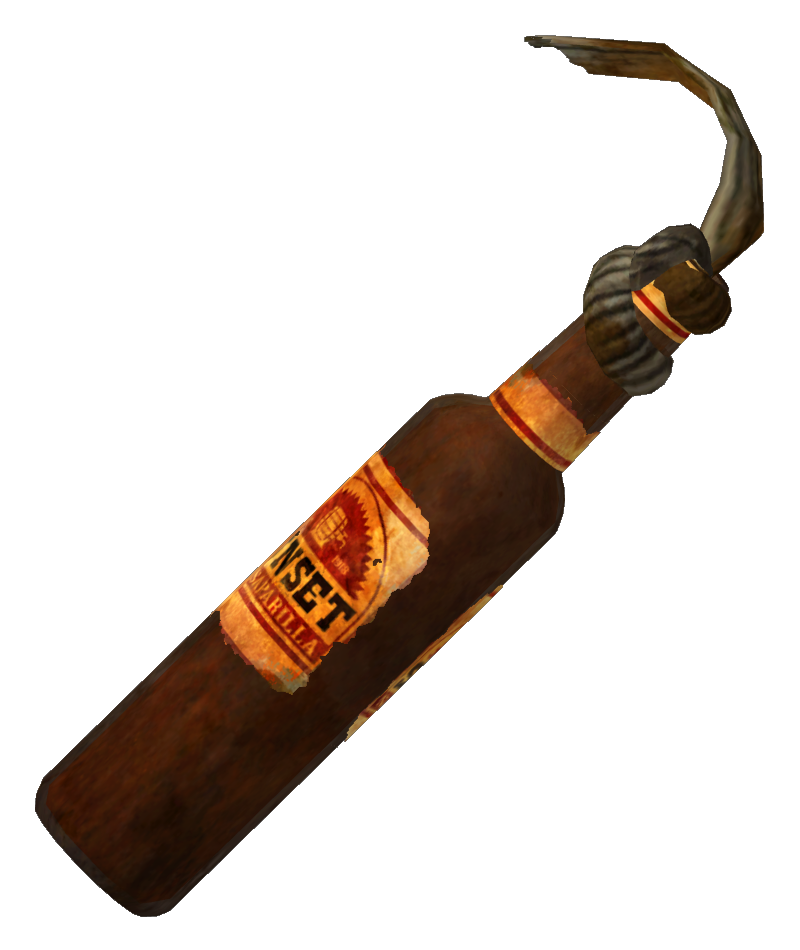 Es handelt sich um einen Molotov Cocktail, hergestellt aus einer Sunset Sarsaparilla Flasche, irgendeinem entzündlichen Material und einem Lappen um es zu entzünden. Es verwandelt Feinde in einen grünen Haufen klebrigen Zeugs (wie bei Plasmawaffen), wird ein kritischer Treffer gelanden.