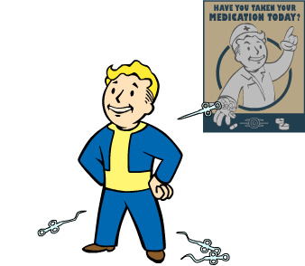 “Immer rein mit dem guten Zeug! Du besitzt eine um 50 Prozent niedrigere Chacne, durch Verwendung von Chems abhängig zu werden.”— Rang-1-Beschreibung