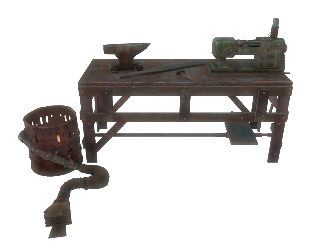 • Im Grunde ist die Rüstungs-Werkbank eine Mischung aus einer Nähmaschine, betrieben durch ein Trittbrett unter der Arbeitsfläche, und einer Schmiede, angefeuert durch ein Blasbalk seitlich des Tisches und einem Ambos auf der Arbeitsfläche.
