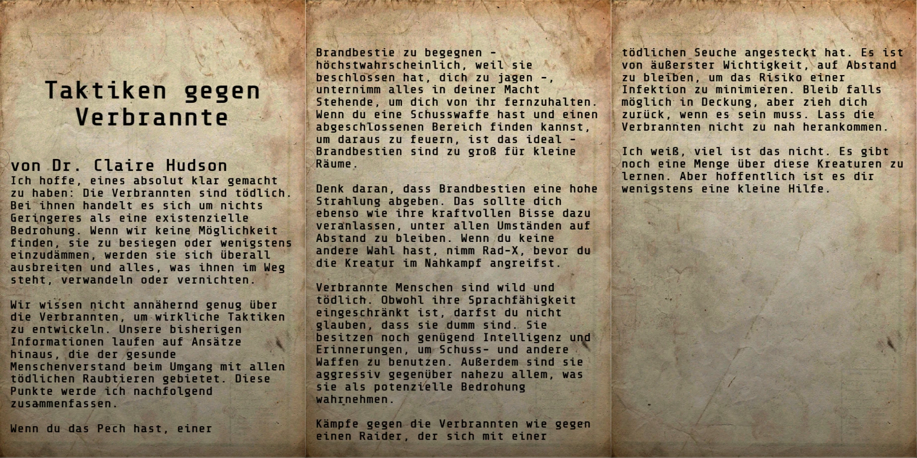Denk daran, dass Brandbestien eine hohe Strahlung abgeben. Das und ihre kraftvollen Bisse sollten dich auf jeden Fall dazu veranlassen, unter allen Umständen auf Abstand zu bleiben. Wenn du keine andere Wahl hast, nimm Rad-X, bevor du die Kreatur im Nahkampf angreifst.