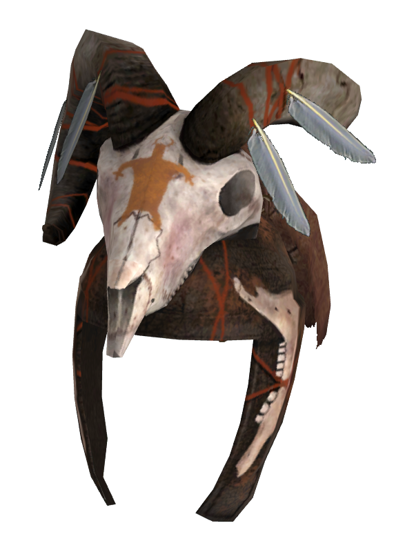 Wie alle Unholdhelme ist auch dieser hier aus einem einfachen Lederhelm gefertigt, der mit dem Schädel und Kieferknochen eines jungen Großhorns verstärkt wurde. Ein paar Federn dienen als Zierde. Dieser Helm bietet eine Schadensschwelle von 1 und einen Bonus von +1 auf die Wahrnehmung. Er kann mit allen Unholdhelmen repariert werden.