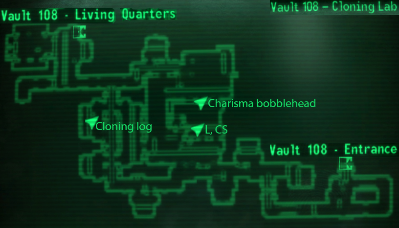 - Die Tür von Vault 108 kann, im Gegensatz zu den meisten Vaults im Ödland der Hauptstadt, nicht länger bewegt werden, da die Kontrollen nicht reagieren