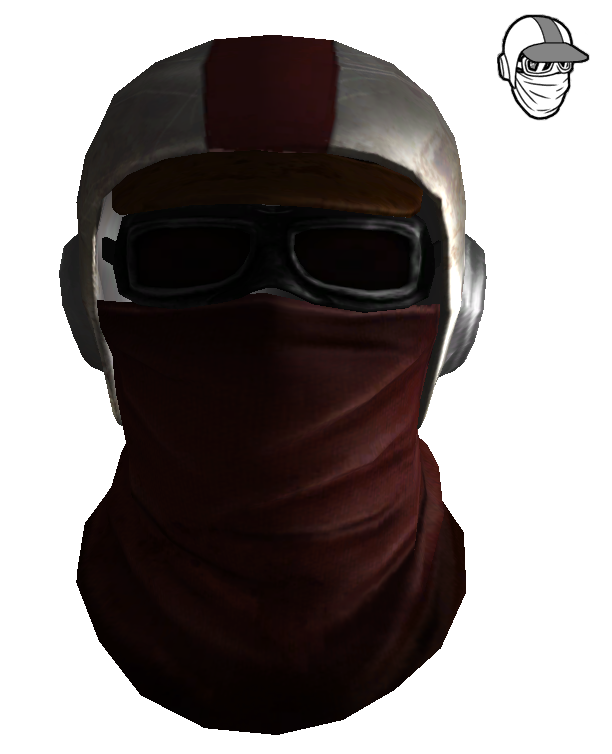 Der Helm besteht aus zusammengewürfelten Bestandteilen anderer Kopfbedeckungen; einer Basball Kappe mot einem Aluminiumhelm, einer Brille und einem Gesichtstuch. Er bietet eine Schadensschwelle von 3, sonst aber keine weiteren Boni. Er kann mit Kopien von sich selbst repariert werden.