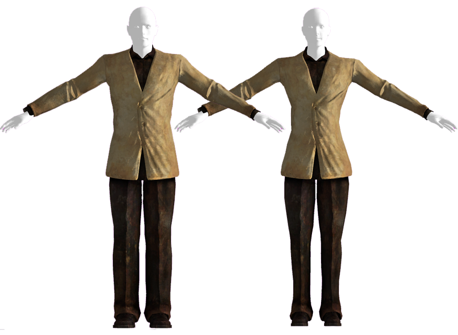 Das Outfit besteht aus einem etwas schmutzigen hellbraunen Blazer mit einem dunklen Button-up Hemd, Hose und Schnürschuhen. Es bietet keine erweiterte Schadensschwelle oder andere Boni.