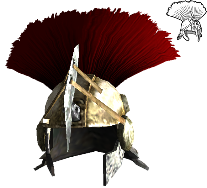 Es handelt sich um einen Metallhelm mit rotem Federschmuck. Er ist den alten römischen Offiziershelmen nachempfunden. Er bietet eine Schadensschwelle von 5, sonst aber keine weiteren Boni. Er kann mit Kopien von sich selbst repariert werden.